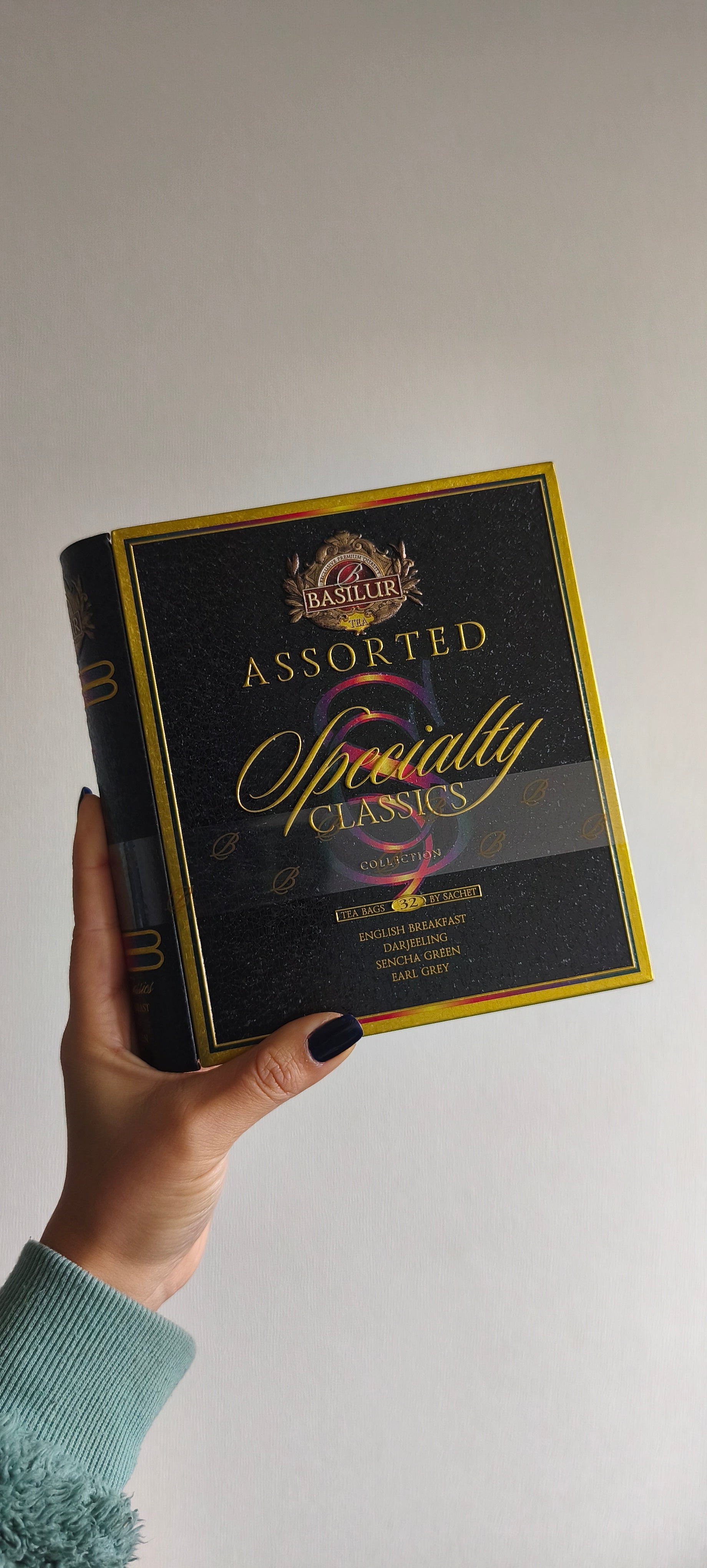 Lata metálica presentación tipo libro, contiene 32 bolsitas de té en diferentes versiones y sabores de te negro, te verde y te blanco.